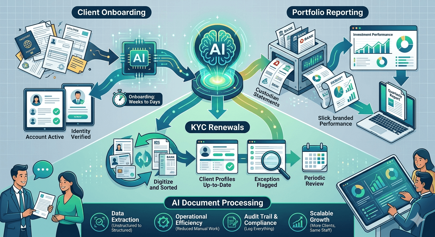 A new client signs their advisory agreement on a Tuesday. Three weeks later, they're still waiting for their account to be active. Somewhere in that gap, a compliance officer is chasing a missing passport copy. An ops team member is re-keying address details from a utility bill into a CRM. Someone else is manually cross-checking fund statements against a spreadsheet to build a quarterly report.